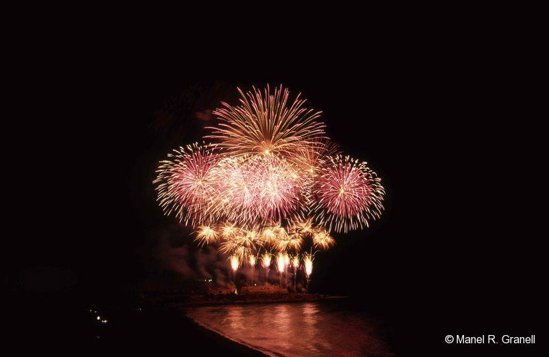 És curiós com, després de tants anys, el que arrenca més “Oooh” de la platja són el que tots coneixem com a “palmeres”. Aquells coets que quan no poden enlairar-se més senzillament exploten i cau un nombre d’espurnes incalculable. Color bronze i cel blau marí. És com si les il·lusions i idees prenguessin vida il·luminant les cares de la gent.