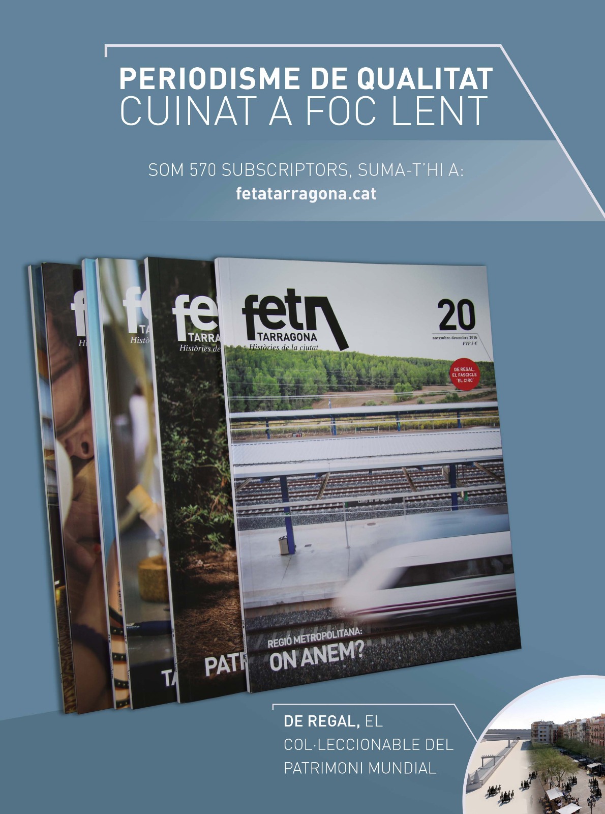 En aquest sentit, en començar el 2017 volem agraïr especialment el compromís dels 570 subscriptors de la revista, els que hi són des del primer dia i els que s’hi han afegit els darrers mesos. I als que no en sou, de subscriptors, us convidem a afegir-vos a la comunitat d’amics del FET. Per només 30 € l’any, rebreu còmodament a casa totes les revistes i els fascicles del col·leccionable ‘Tàrraco, Patrimoni Mundial. Una nova visió’. Aquesta setmana, que surt al carrer el número 21, us convidem a regalar o regalar-vos periodisme tranquil i reflexiu. La subscripció la podeu completar fàcilment clicant aquí.
